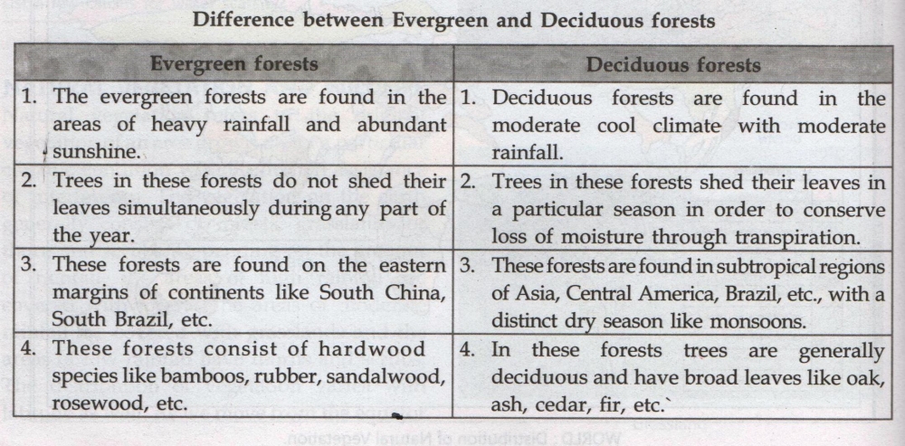 Q10. State three points of differences between tropical evergreen and deciduous forests.