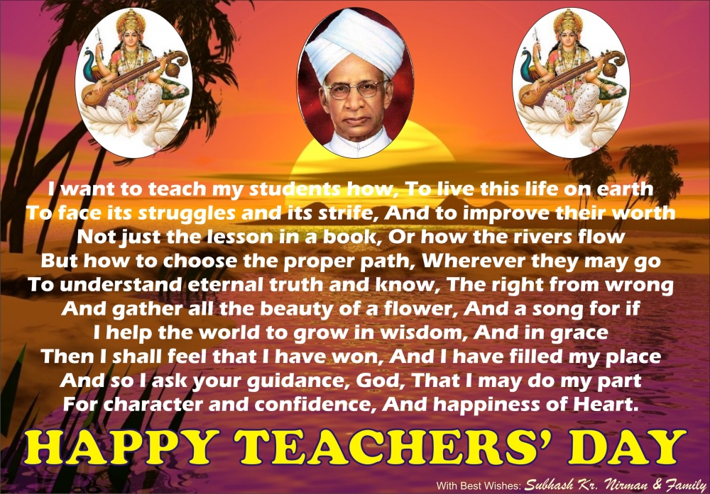 To enable development of youth first and foremost, the teacher's love for teaching is essential, with teaching as the soul of the teacher. The teacher must realize that they are responsible for shaping not just students but ignited youth who are the most powerful resource under the earth, on the earth and above the earth. With their full commitment to the great mission of teaching, the teacher transforms himself or herself as a great teacher only when he or she is capable of elevating the average student to high performance. The teacher conducting himself or herself in a noble way itself is a lifetime message for students. They should encourage the students and children to ask questions and develop the spirit of enquiry, so that they blossom into creative enlightened citizens. They should treat all the students equally and should not support any differentiation on account of religion, community or language and continuously upgrade the capacities in teaching so that they can impart quality education to the students. They should realize by being a teacher, they are making an important contribution to the efforts of national development. The teachers must constantly endeavour to fill their mind, with great thoughts and spread the nobility in thinking and action among the students. Teacher should celebrate the success of the students.